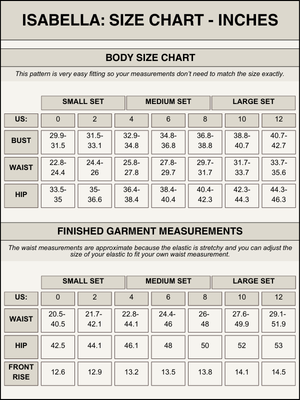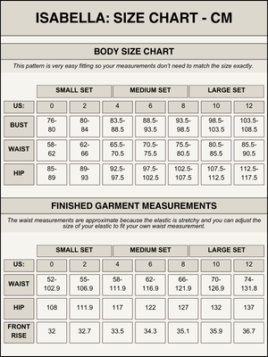 The size guide link is at the top of this product page. Please check the fit notes for each pattern separately. Different styles have different fits (ie. oversized or close-fitting), and the finished garment measurements are available in the product images and instructions.